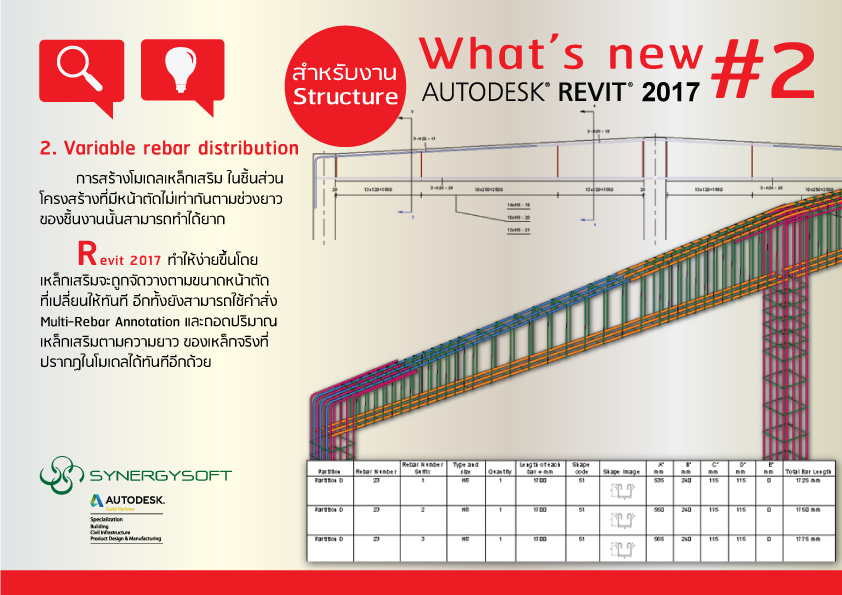 Revit 2017 ทำให้การจัดวางเหล็กเสริมในชิ้นส่วนโครงสร้างที่มีหน้าตัดไม่เท่ากันตามช่วงยาวของชิ้นงานนั้น สามารถทำได้ง่ายขึ้นโดยเหล็กเสริมจะถูกจัดวางตามขนาดหน้าตัดที่เปลี่ยนไปให้ทันทีตลอดความยาวของชิ้นงานนั้นๆ อีกทั้งยังสามารถใช้คำสั่ง Multi-Rebar Annotation และถอดปริมาณเหล็กเสริมตามความยาวของเหล็กจริงที่ปรากฏในโมเดลได้ทันที อีกด้วย