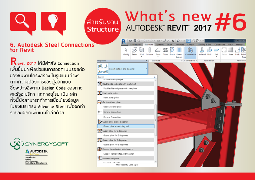 Revit 2017 ได้มีคำสั่ง Connection เพิ่มขึ้นมาเพื่อช่วยในการออกแบบรอยต่อของชิ้นงานโครงสร้าง ในรูปแบบต่างๆตามความต้องการของผู้ออกแบบ ซึ่งจะอ้างอิงตาม Design Code ของทาง สหรัฐอเมริกา และทางยุโรป เป็นหลัก ทั้งนี้ยังสามารถทำการเชื่อมโยงข้อมูลไปยังโปรแกรม Advance Steel เพื่อจัดทำรายละเอียดเพิ่มเติมได้อีกด้วย