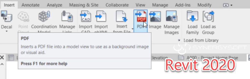 ใน Revit 2020 นั้น ได้เพิ่มคำสั่งนำเข้า PDF ขึ้นมาในชุดคำสั่ง Insert ทำให้สามารถนำเข้าไฟล์ PDF เข้ามาได้โดยตรง ลดขั้นตอนการแปลงไฟล์ก่อนนำเข้า ทำให้การทำงานสะดวกมากขึ้น ดังรูป