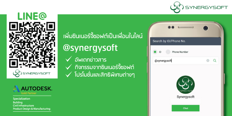Line: @synergysoft ช่องทางใหม่ในการอัพเดทข่าวสาร กิจกรรม โปรโมชั่นและสิทธิพิเศษต่างๆ จาก ซินเนอร์จี้ซอฟต์ เพียงแอดไลน์เราวันนี้ ท่านก็จะได้รับทราบข่าวสารใหม่ๆ เทคนิคการใช้งาน กิจกรรมดีๆ และโปรโมชั่นพิเศษเกี่ยวกับซอฟต์แวร์ออโต้เดสก์ก่อนใคร มาเป็นเพื่อนกับเรากันเลย