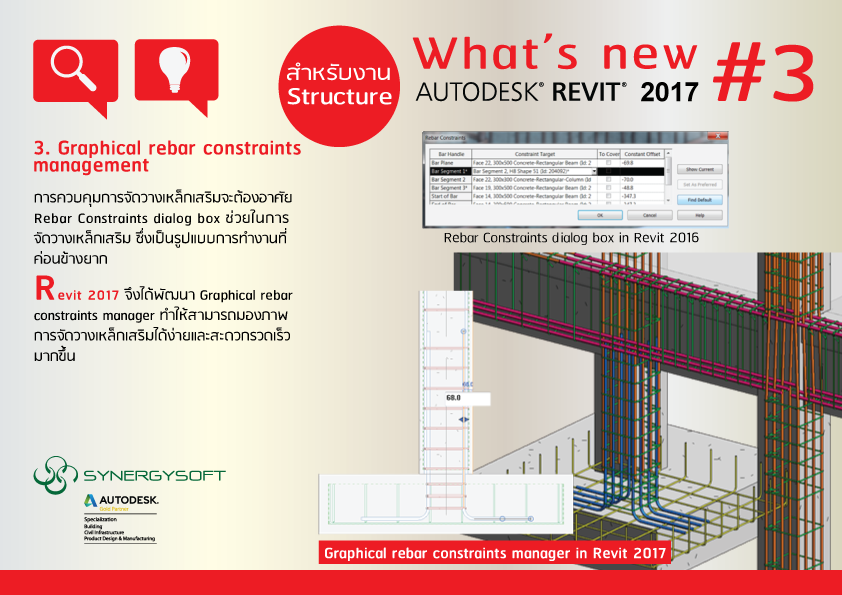 Revit 2017 ได้พัฒนา จาก Rebar Constraints dialog box มาเป็น Graphical rebar constraints manager ซึ่งจะทำให้สามารถมองภาพการจัดวางเหล็กเสริมได้ง่ายและสะดวกรวดเร็วมากขึ้น