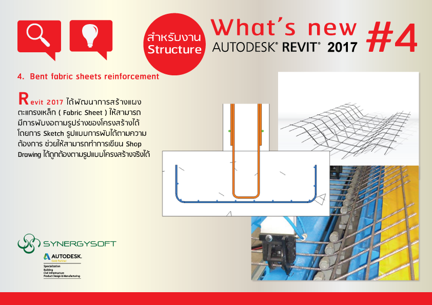 Revit 2017 ได้พัฒนาการสร้างแผงตะแกรงเหล็ก ( Fabric Sheet ) ให้สามารถที่จะมีการพับงอตามรูปร่างของโครงสร้างได้โดยการ Sketch รูปแบบการพับได้ตามความต้องการ ช่วยให้สามารถทำการเขียน Shop Drawing ได้ถูกต้องตามรูปแบบโครงสร้างจริงได้