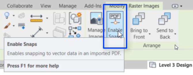หลังจากนำเข้ามาแล้วสามารถเลือกคำสั่ง Enable Snap เพื่อใช้ในการสร้าง เส้นตามไฟล์ PDF ได้ ดังรูป