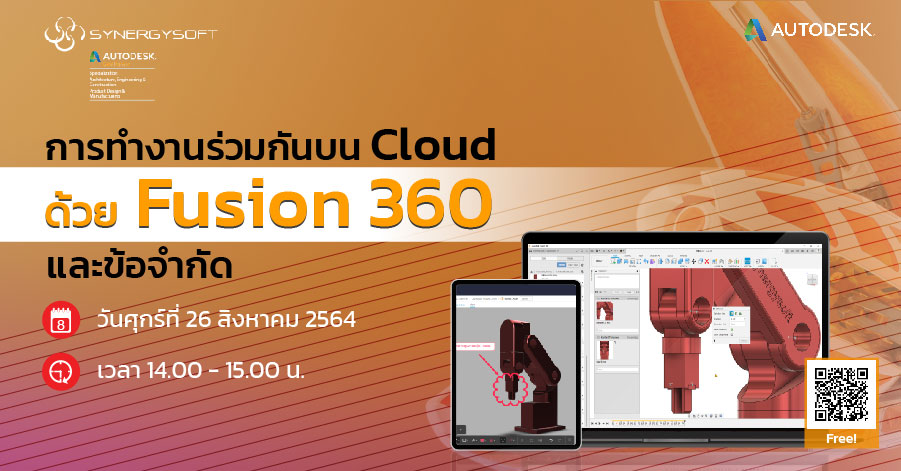 บริษัท ซินเนอร์จี้ซอฟต์ โซลูชั่น จำกัด ขอเรียนเชิญท่านเข้าร่วมสัมมนา e-webinar เพื่อทำความเข้าใจและเรียนรู้การเริ่มต้นการออกแบบและข้อจำกัดในการใช้งาน Autodesk Fusion 360 รวมถึงการทำงานร่วมกันบนคลาวด์เพื่อก่อให้เกิดการทำงานอย่างมีประสิทธิภาพ