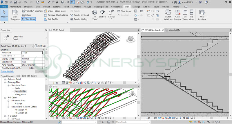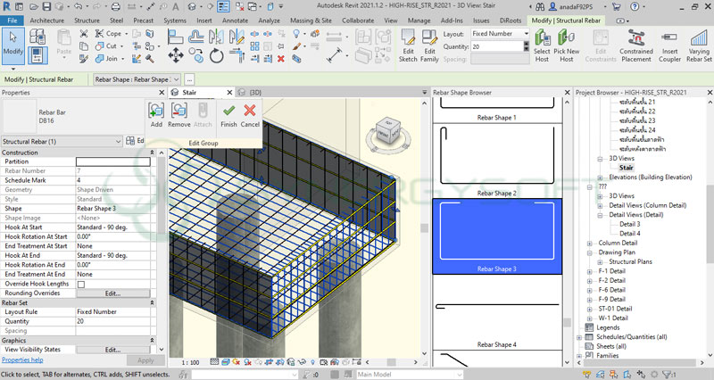 - การเขียนงานเหล็กเสริมใน 2D และ 3D และการตั้งค่า Detail Level และ Rebar Stage เพือจัดการแสดงผล